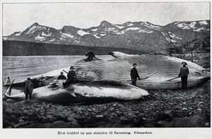 Hval trukket opp på stranden til flensing (fra: Risting, S., 1922. Av hvalfangstens historie, Kristiania, p. 136).